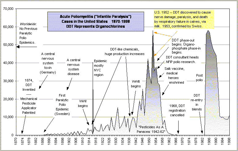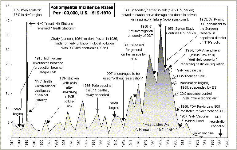 This smooth, loaded phrase, framed with glossy photos and clever captions, goes down like lubricated jello. However, if we contain our admiration, and review the actual data, we realize that the great polio epidemic actually occurred from 1942 (or gradually, beginning decades earlier) to 1962, that is, it was not a „postwar epidemic”. The epidemic declined not „in the early ’60s”, but a full decade earlier, in the early 1950s. Polio case rates did not „taper off… after the Salk vaccine” as Time would have us believe – case rates dove resolutely downward two years before the Salk vaccine field trials and four years before the vaccination programs were firmly underway. The decline of polio actually occurred after heated discussions regarding the dangers of DDT that began with in-house government/industry reviews of DDT in 1951, following Biskind and other’s criticism of pesticides which began in 1949. These discussions were followed by a phase-out through industry compliance, a huge shift of sales to third-world countries, a phase-in of less-persistent pesticides, which was facilitated by legislation in 1954 and 1956, a renewed public image regarding the proper use and dangers of pesticides, the cancellation of DDT registration by 1968, and eventually the official ban of many of the persistent organochlorine pesticides by 1972 (in U.S. and developed countries).