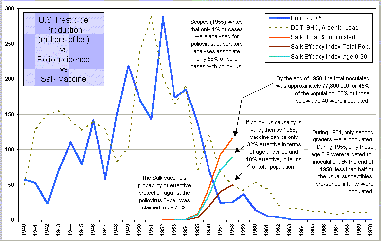 Notice that while pesticide production directly correlates with polio case rates through every peak and valley, the Salk vaccine enters only after polio’s decline. Salk’s point of entry is not sufficient evidence to be routinely offered as proof for the victory of vaccines over the poliovirus, as Time implies, and as implied by Hayes and Laws, and virtually all other presentations of polio history in whatever media or educational forum.