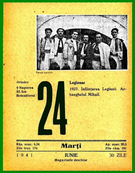24 iunie 2012 Nasterea Sfantului Ioan Botezatorul Aducerea moastelor Sfantului Mare Mucenic Ioan cel nou de la Suceava 85 de ani de la infiintarea Legiunii Arhanghelul Mihail Cititi si articolul : Mişcarea Legionară la 85 de ani de la înfiinţare. O Mişcare dumnezeiască de reînviere a Neamului şi a Bisericii